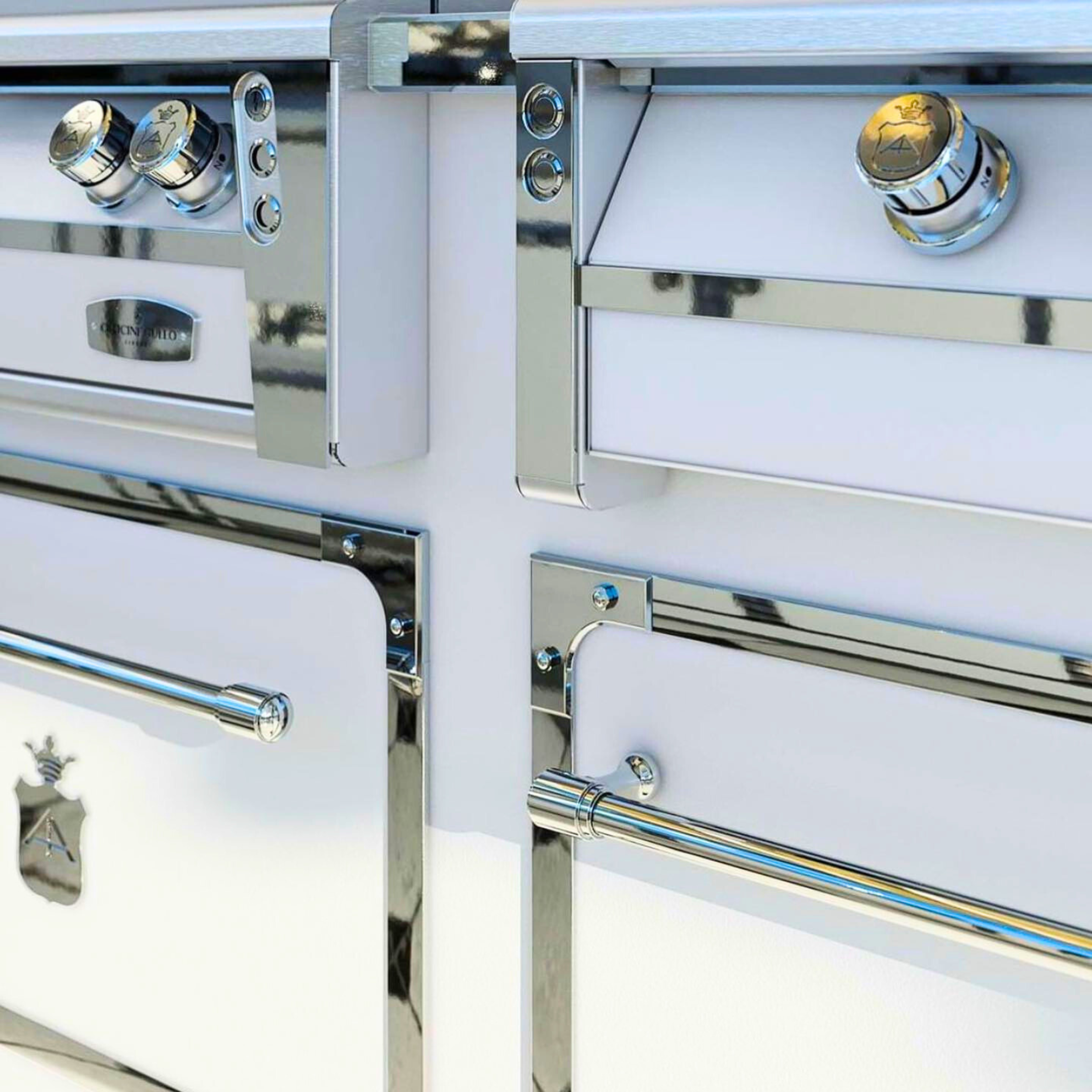 Close-up of a modern outdoor gas grill with stainless steel knobs and handles, and a white body.